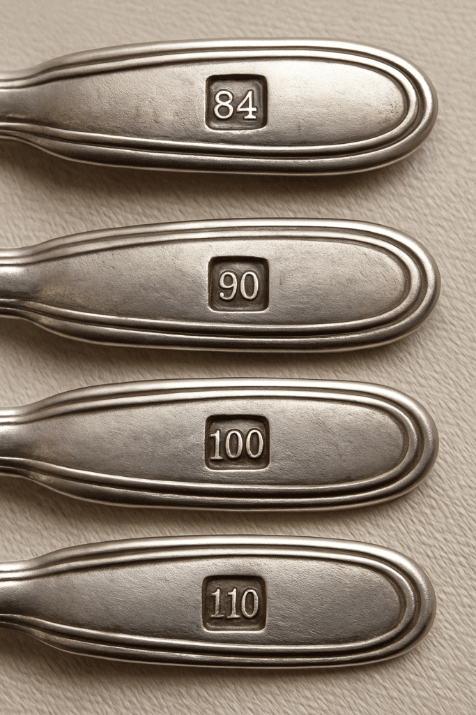Sur Achat-Metal-Argente.fr, nous vous aidons à identifier facilement les poinçons présents sur vos cuillères, fourchettes, couteaux et ménagères. Ces petits marquages discrets — qu’il s’agisse d’un carré avec un chiffre (84, 90, 100, 110) indiquant du métal argenté, ou d’un octogone Minerve garantissant l’argent massif (.950 ou .800) — permettent de connaître la véritable nature et la valeur de vos objets.