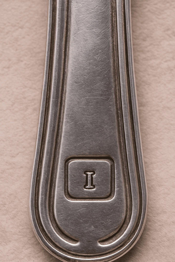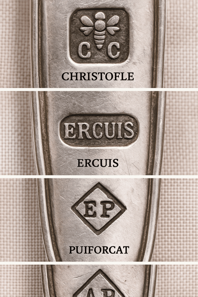 En plus des poinçons de titre (84, 90, 100, 110 pour le métal argenté, ou Minerve pour l’argent massif), les couverts portent souvent un poinçon de fabricant.
